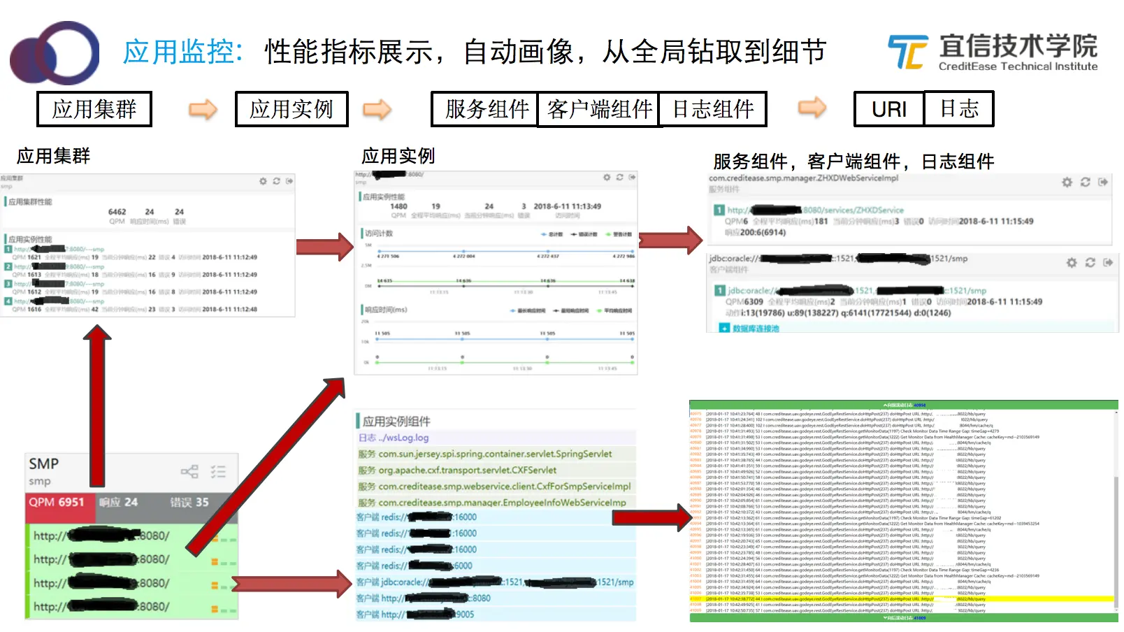 可以从应用集群的展示界面,钻取到应用实例的监控展示界面,再钻取到自动画像出来的服务组件/客户端组件和日志组件的展示界面,最后再钻取到服务组件/客户端组件的每个URI的监控指标界面以及日志展示界面。可以从全局钻取到细节,获取想看的监控数据。