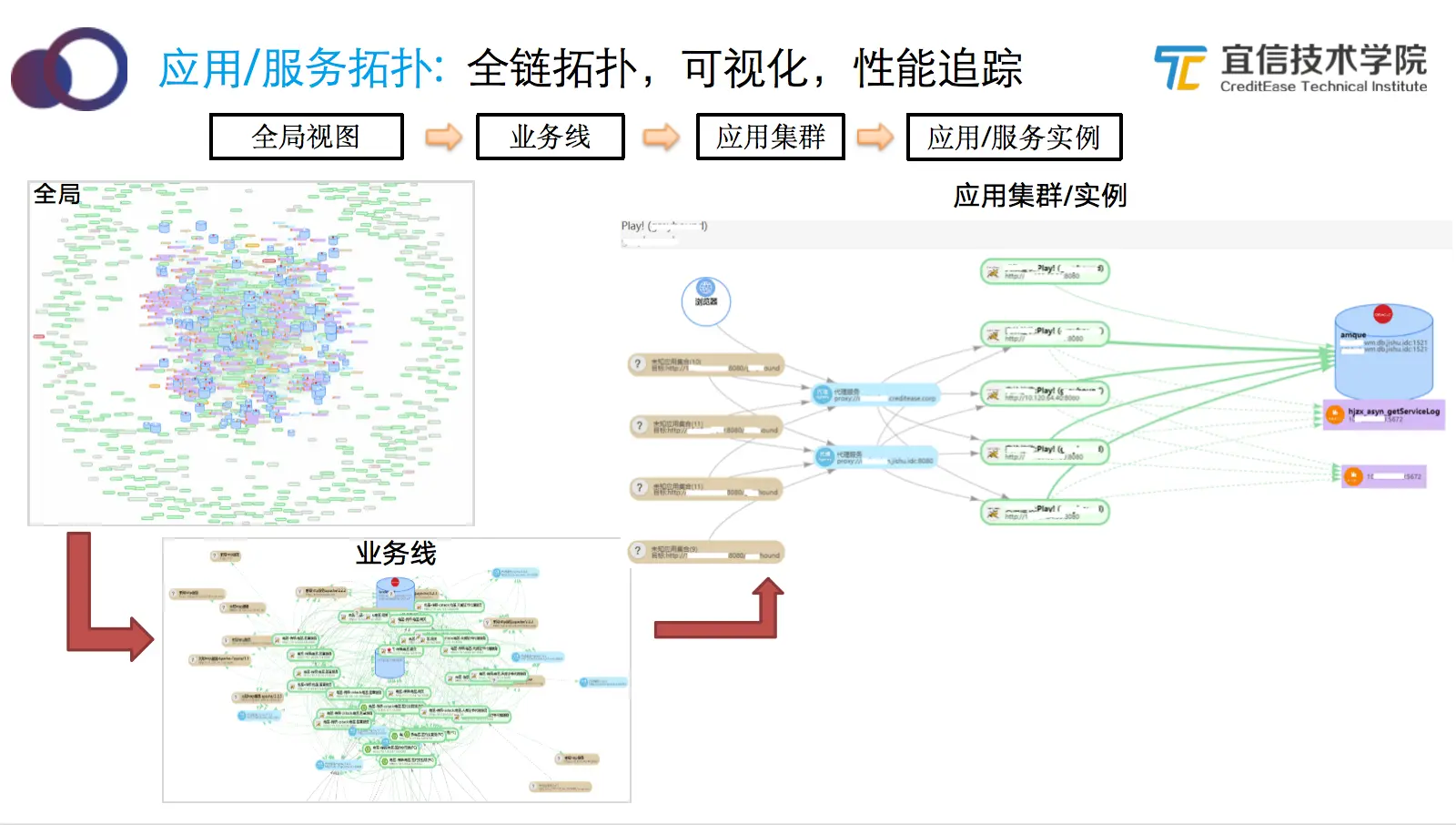 如图,我们可以从全局的服务流钻取到某个业务线的服务流,再钻取到该业务线下某个应用集群/实例的服务流,进行全局范围的性能追踪。