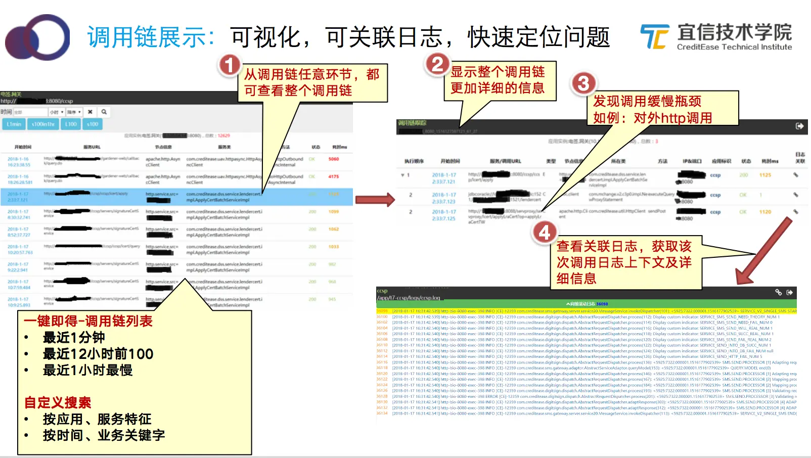 - 发生问题后,可以发出具有业务涵义的告警消息,将业务问题直接反馈给业务/运营人员;也能根据调用链快速定位到问题节点,从而帮到技术运维人员;此外,技术人员与运营人员也可通过业务ID反查系统链路来追溯问题。