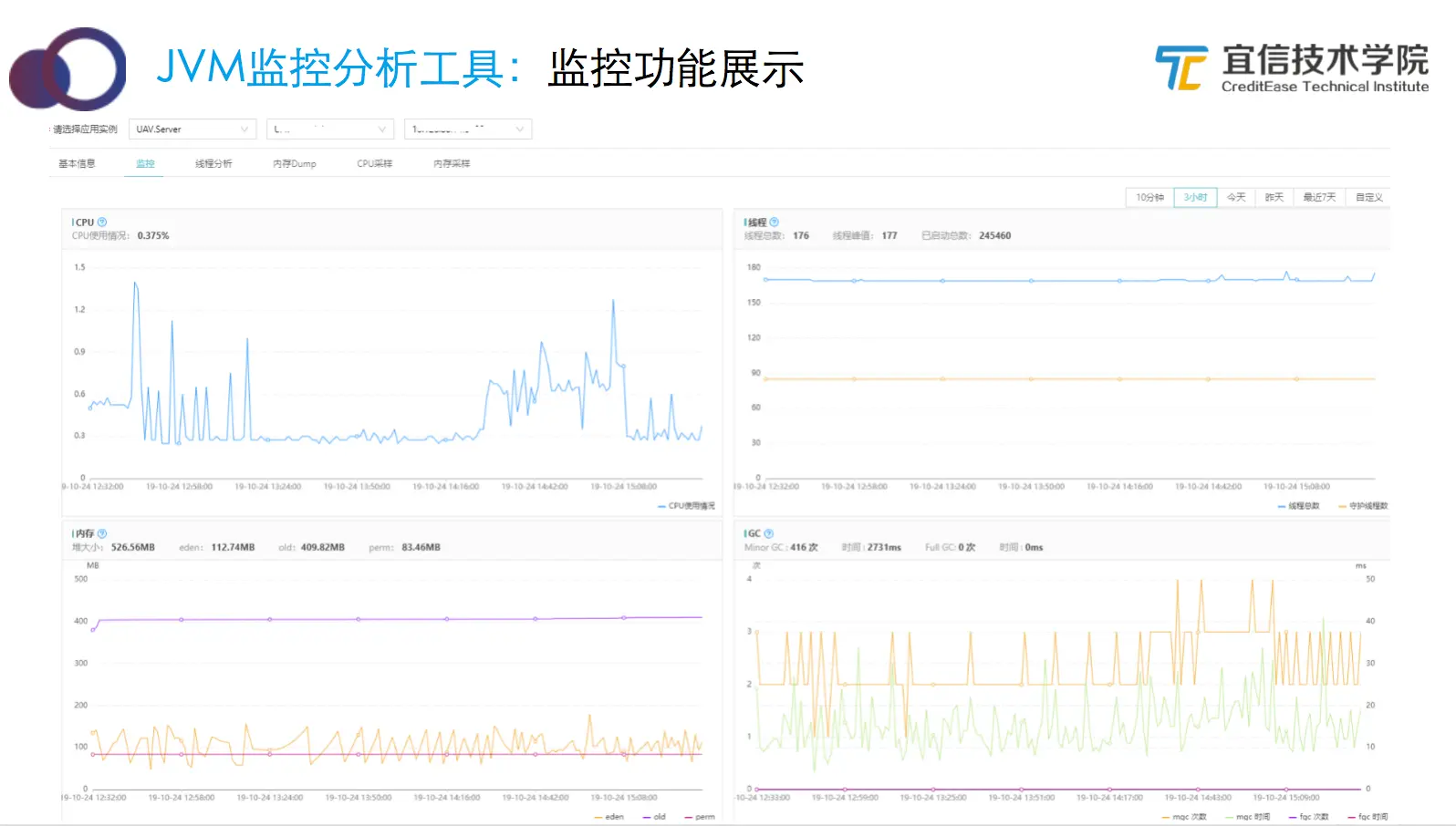 上图是JVM监控分析工具的监控功能展示页面。JVM监控分析工具的功能主要包括: