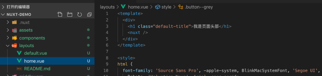 此时,该页面就会使用 home.vue 文件作为默认布局,并将页面内容插入到 home.vue的 <nuxt /> 标签里 。