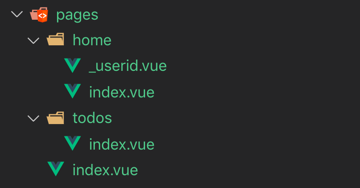 值得注意的是, Nuxt的路由是根据pages中的文件结构自动生成的,比如,pages文件结构是这样: