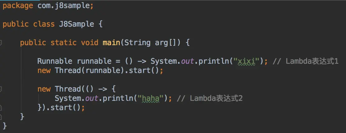 Runnable runnable = () -> System.out.println("xixi"); // lambda表达式1