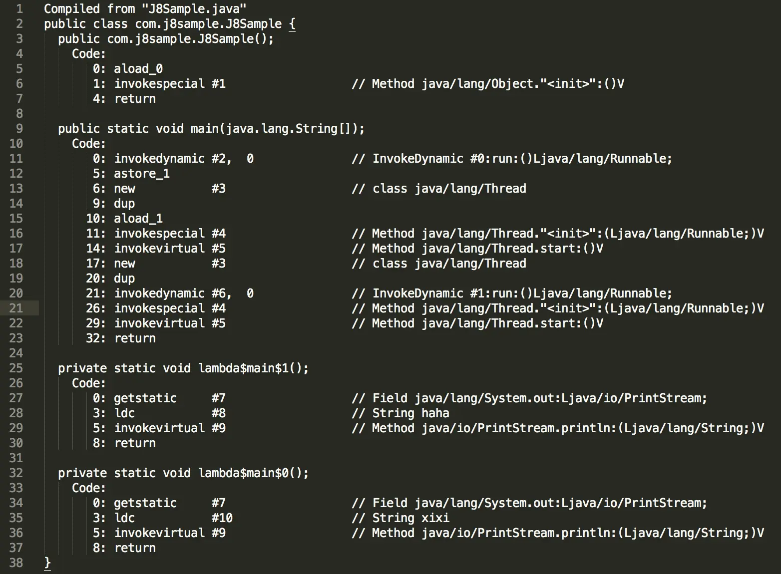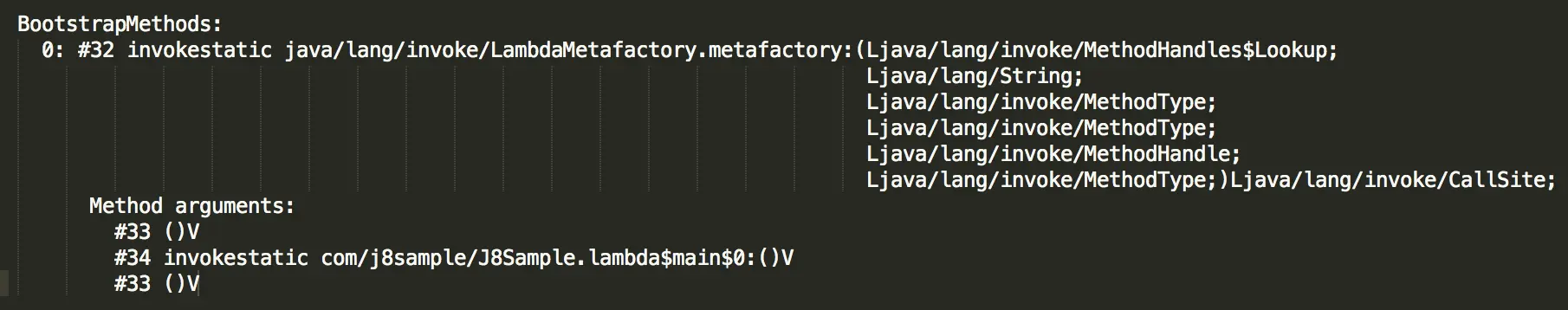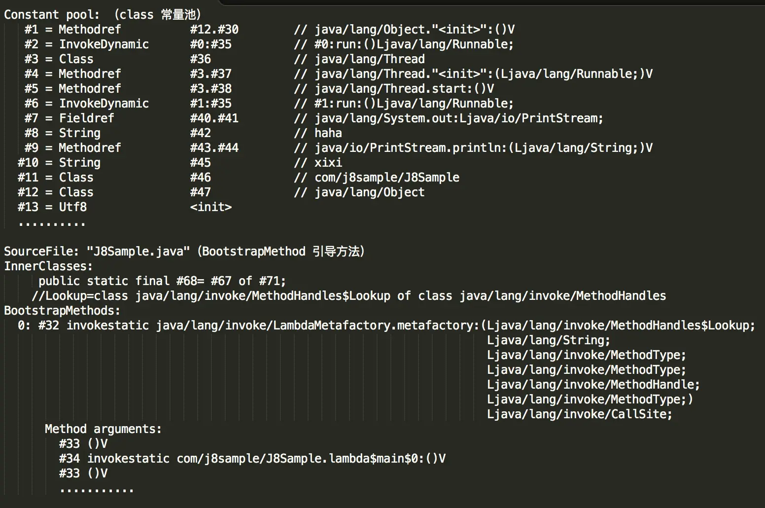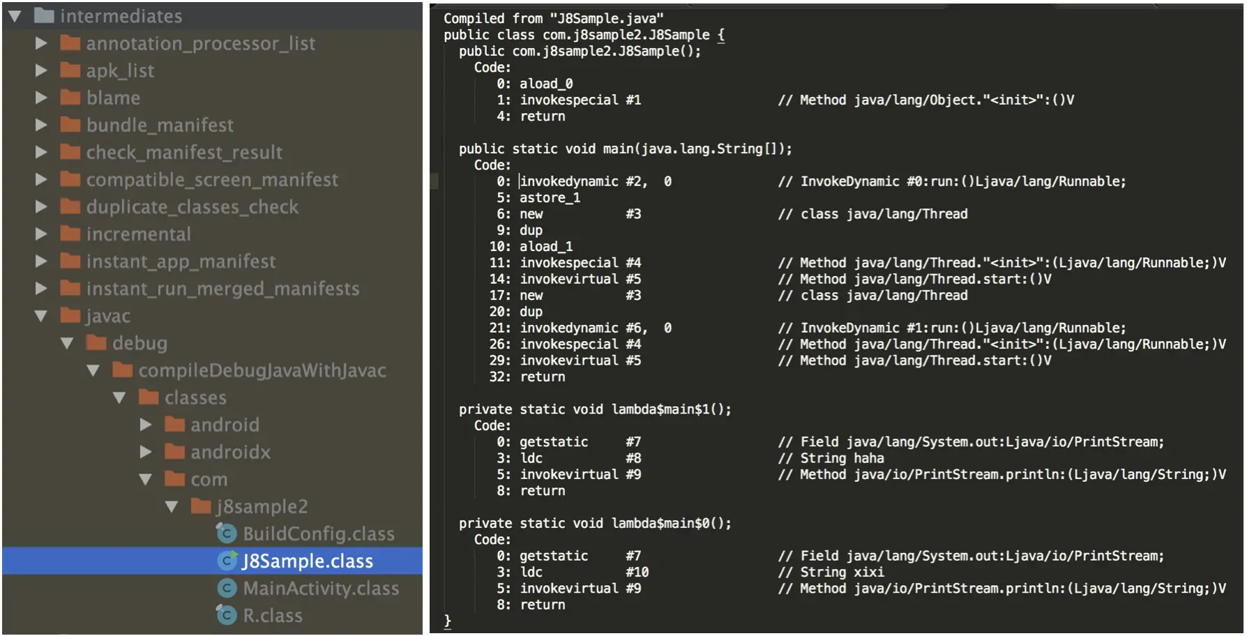 javac编译之后的J8Sample.class还是使用invokedynamic指令,即这一步并没有Desugar:
