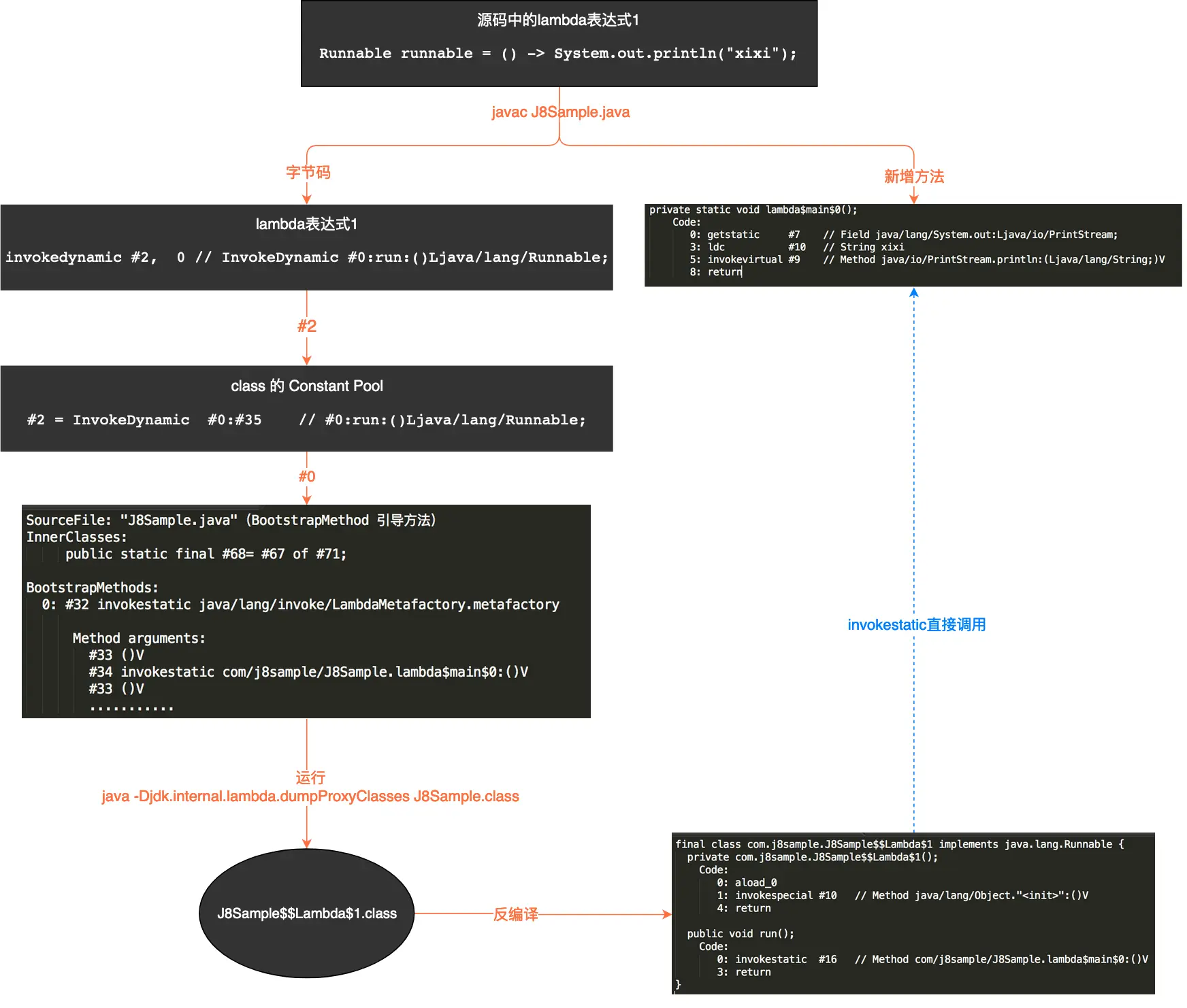 结合J8Sample.class字节码,并对invokedynamic指令调用过程进行跟踪分析。总结如下: