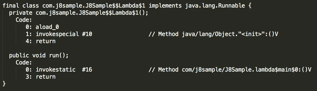 在run方法中使用了invokestatic指令,直接调用了J8Sample.lambda$main$0这个在编译期间生成的静态私有方法。