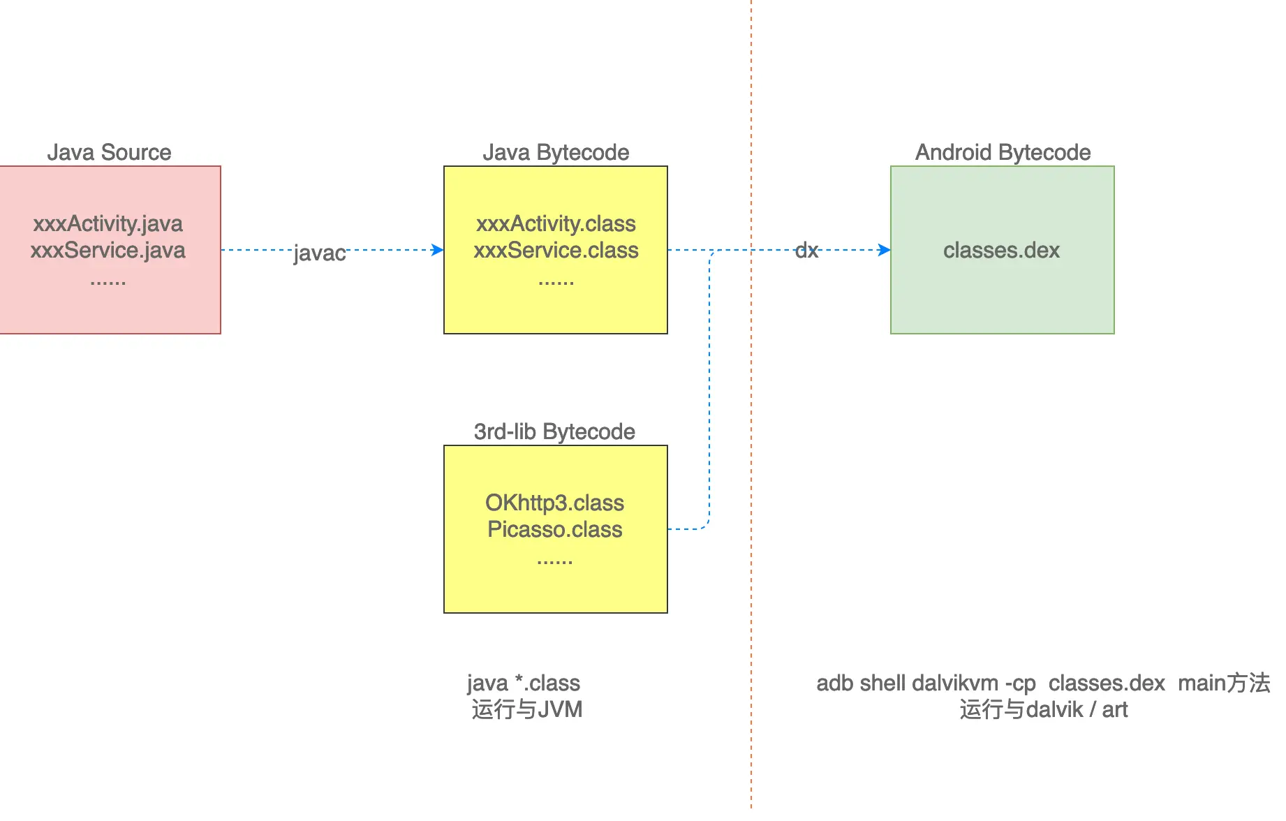 回到Android系统上,Java-Bytecode(JVM字节码)是不能直接运行在Android系统上的,需要转换成Android-Bytecode(Dalvik/ART 字节码)。