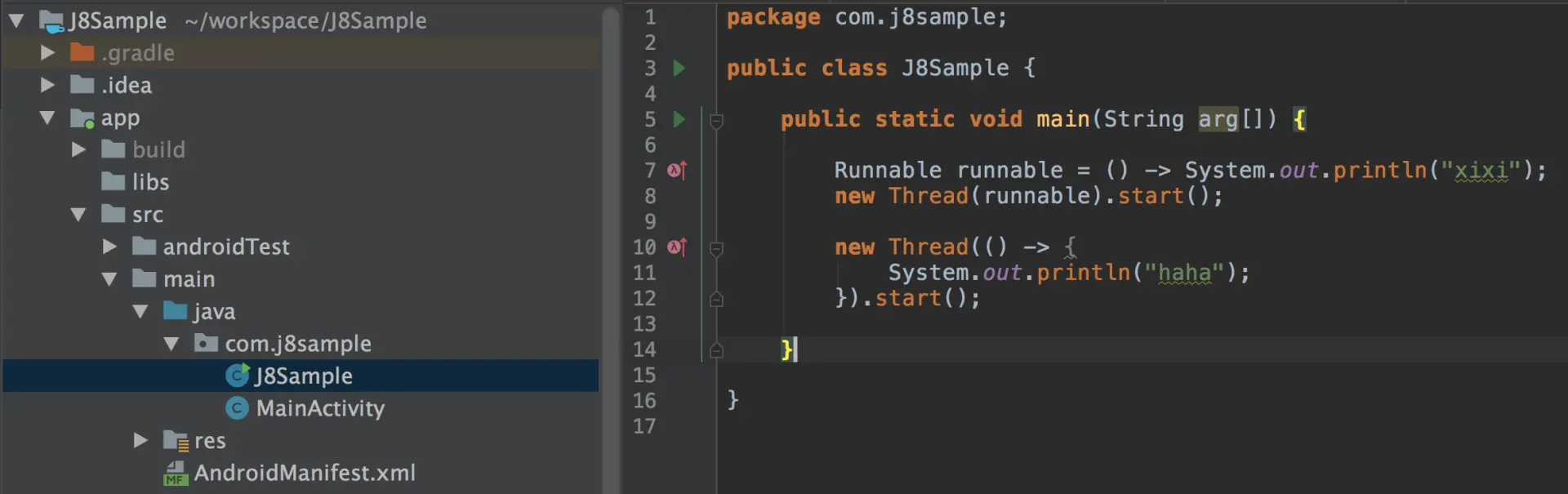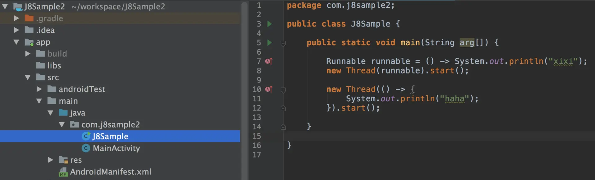 将实例中的J8Sample.java放到一个配置了Retrolambda的Android工程中: