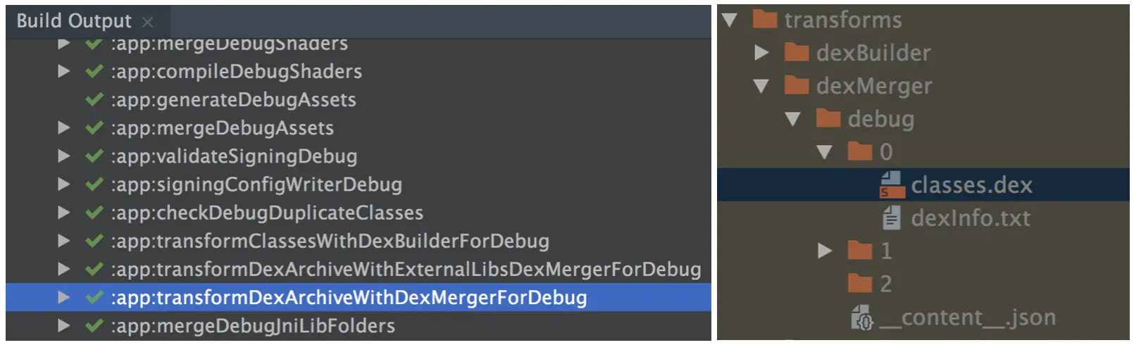 在app:transformDexArchiveWithDexMergerForDebug(对应dx)任务之后,再对应build/intermediates/transforms/dexMerger目录找第0个classex.dex。