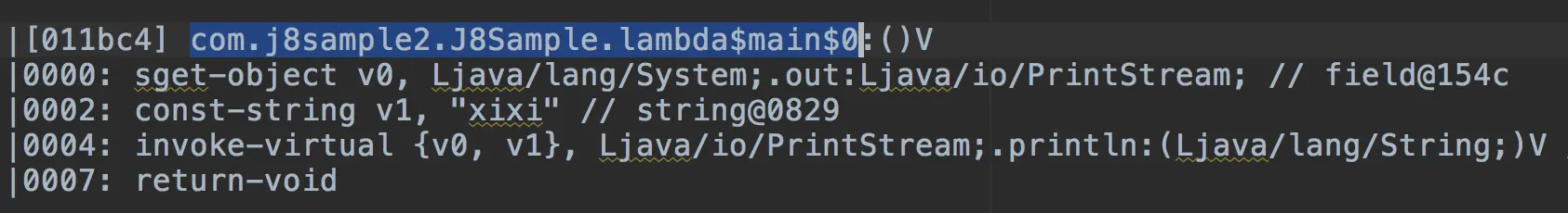 本质上也是参照java/lang/invoke/LambdaMetafactory.metafactory方法直接将原本在运行时生成在内存中的J8Sample\$\$Lambda\$1.class,在D8的编译dex期间,直接生成并写入到dex文件中。