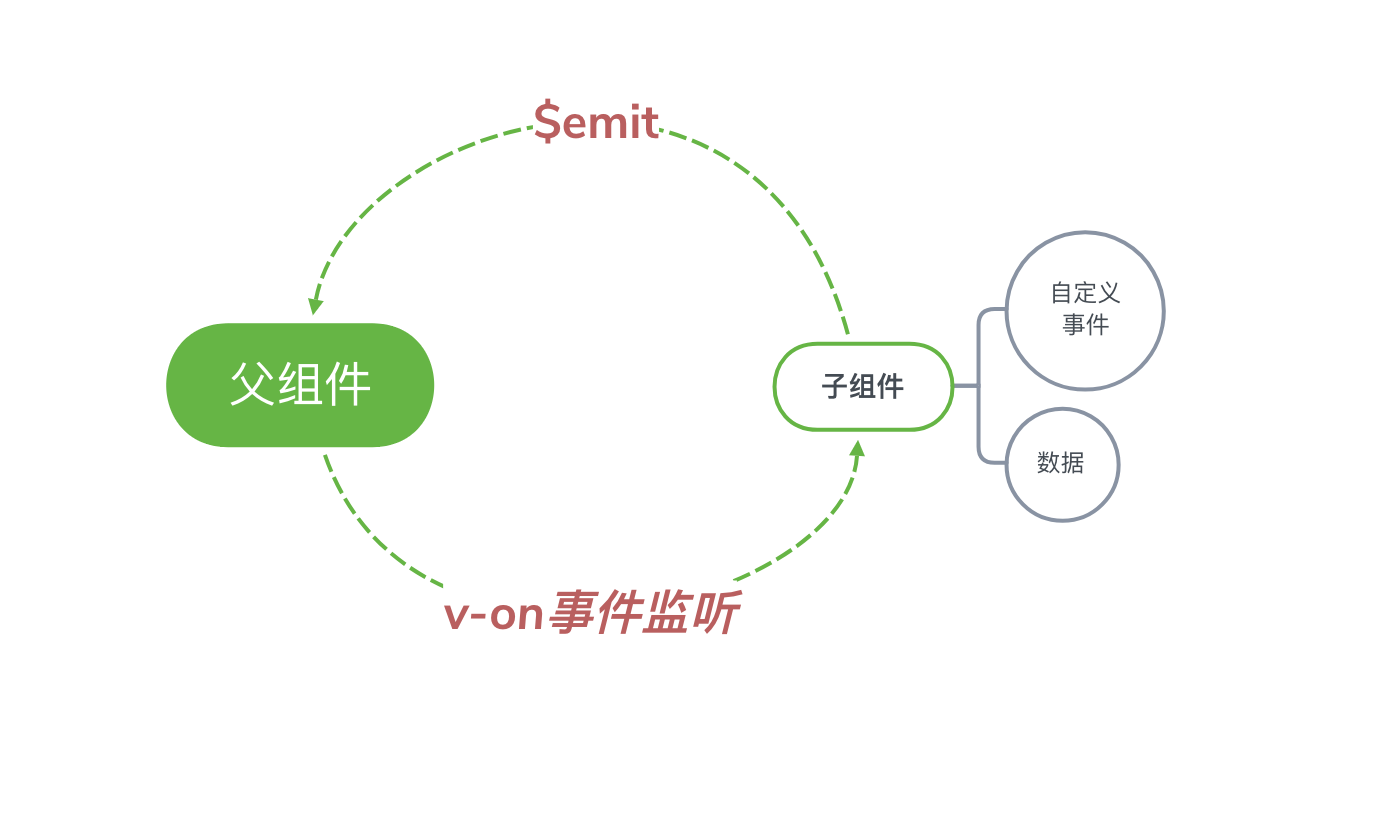 子$emit自定义一个事件,第一个参数为事件名,第二个参数为数据。父v-on绑定一个事件监听器,在绑定的method中以参数形式获得子组件的数据。