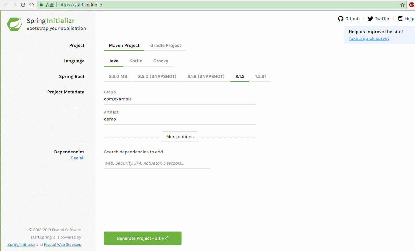 打开这个网站,快速生成一个 Spring Boot 项目。