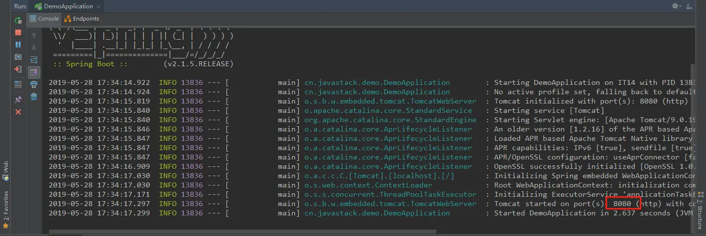 运行 Spring Boot 应用,在 IDE 中运行 DemoApplication main 方法即可。当然,运行 Spring Boot 还有很多方式,参考:运行 Spring Boot 应用的 3 种方式!。