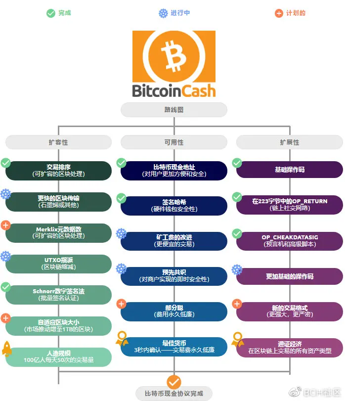 观察BCH的路线图,在扩容性、扩展性、可用性等方面细分了共21个更新计划,目前已经完成了7个计划,距离比特币现金协议完成已经进行了1/3。