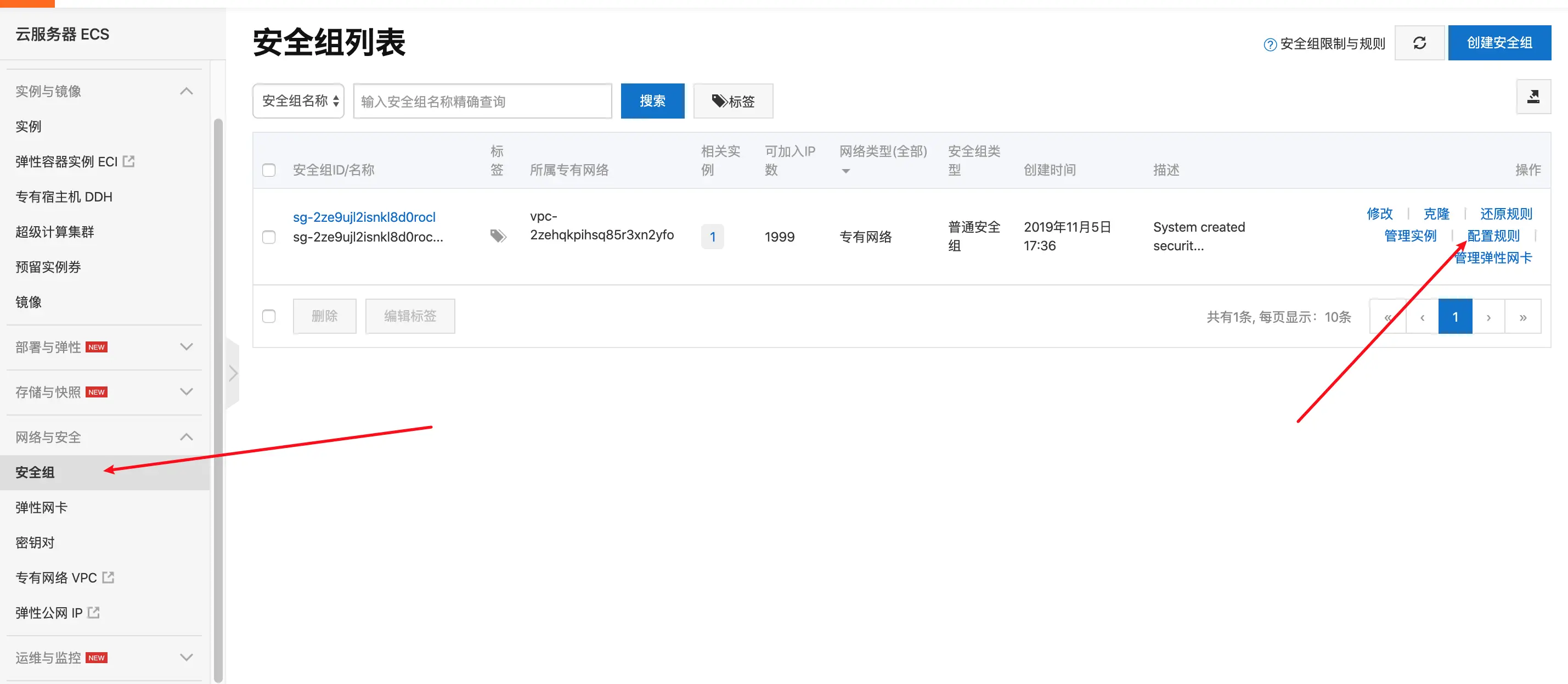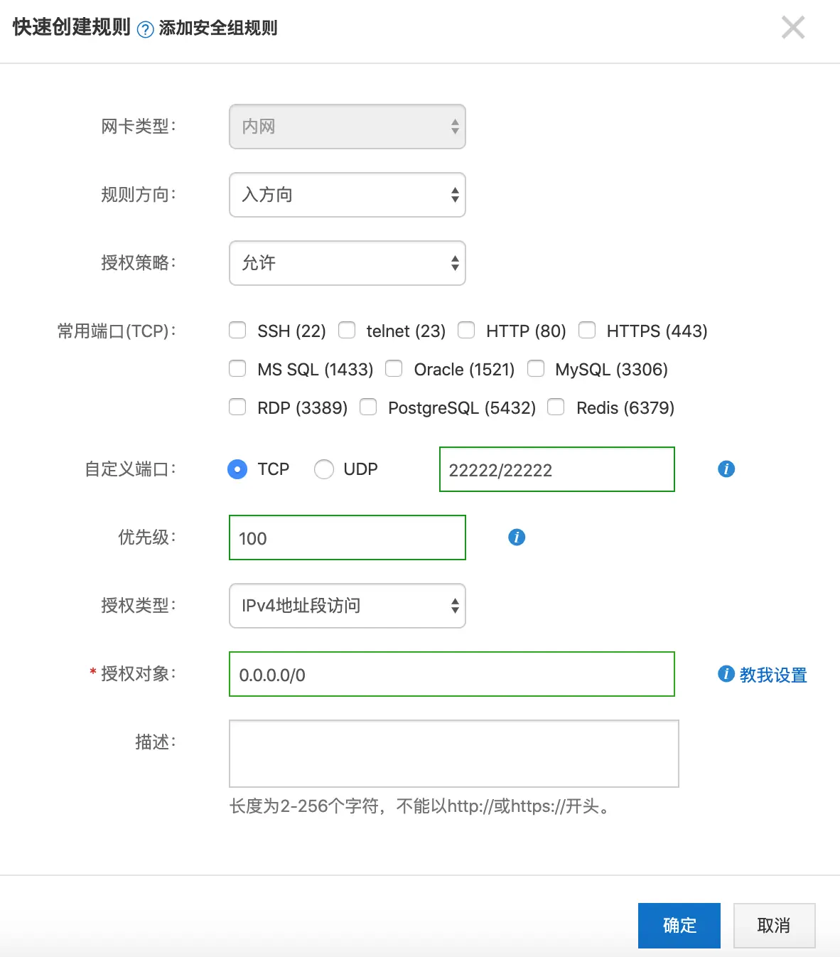 最后在阿里云控制台修改安全策略,添加22222端口,进入安全组规则后点击右上角快速创建规则: