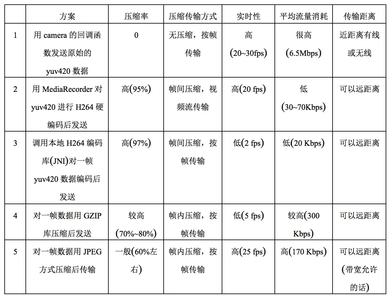 查阅相关文献和资料后对Android的实时图像传输的图像数据处理方式进行了汇总,总结出下表中的五套Android实时图像网络传输方案[5]。
