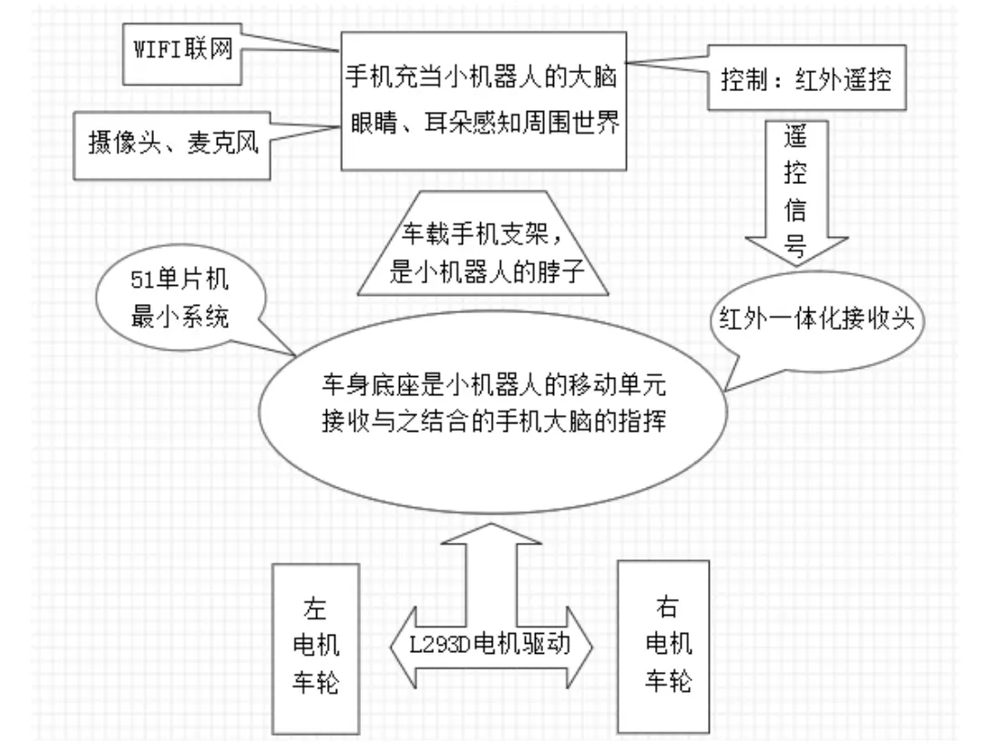 此设计要求实现一个手机可以远程通过WIFI查看小车上的手机摄像头拍摄的画面并控制小车移动。利用淘汰的智能手机的摄像头,实时采集视频图像信号并通过无线WIFI网络将视频信号实时传输到手机端观看,再通过小车上的手机的红外遥控功能对小车进行移动方向、速度的控制。使用C语言开发单片机程序,用Java语言开发安卓程序。