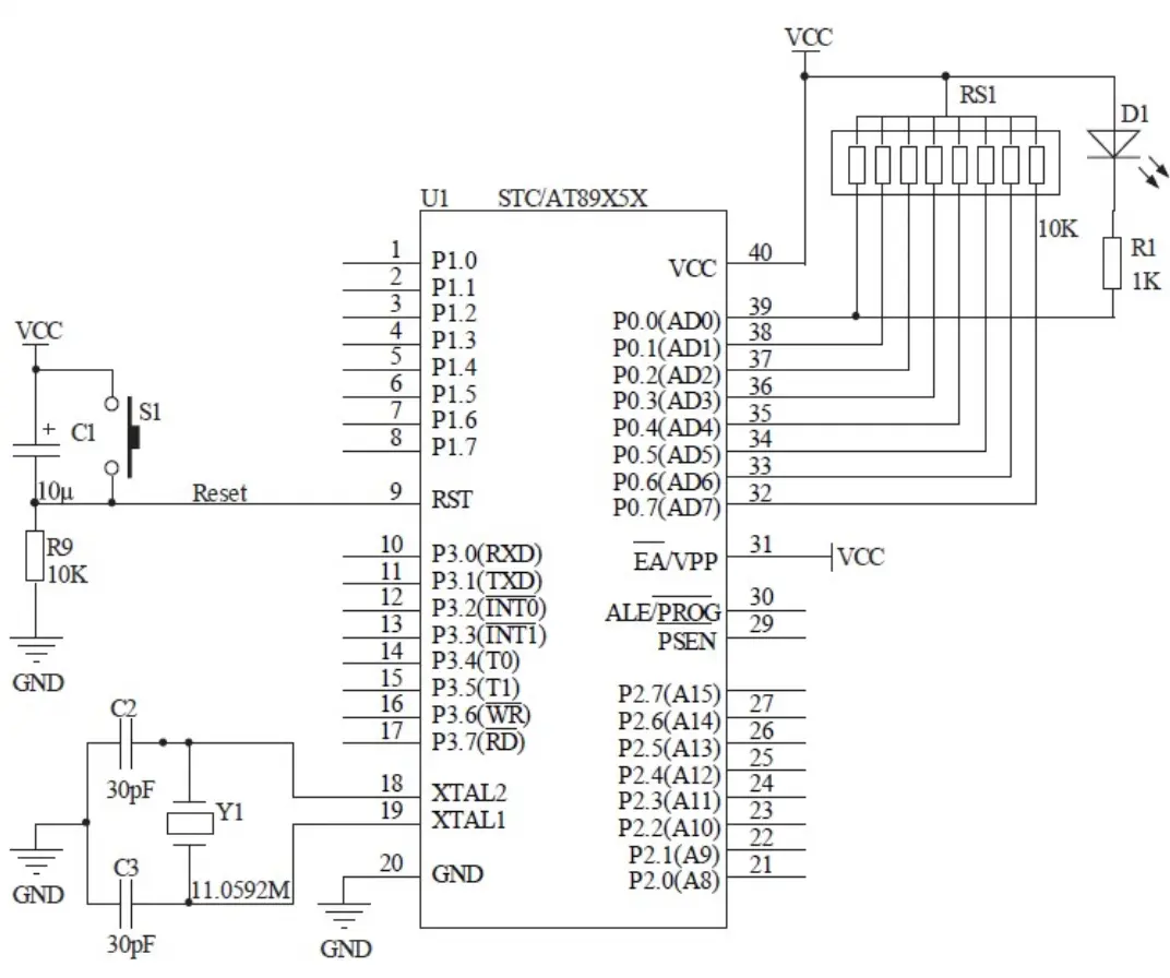 STC89C52RC单片机可谓是国产单片机发展历程上的一块里程碑,初步做到了国内量产。而52单片机则是51的升级版,不断发展的半导体工艺也让该单片机的功耗不断降低。不仅仅是做到了能耗上的升级,也进一步加强了单片机的处理性能。在保持原有的8位处理器不变的大方针下,采用了CMOS的生产工艺STC89S52RC单片机片内集成512字节RAM、8K字节ROM。在烧写次数方面达到了1000次左右的优良性能,低功耗模式情况下时钟系统虽然会停止工作,但是内部的寄存器还是能够进行正常的处理。为了适应不同的使用场合,这款单片机提供了多种封装,本次设计根据最小系统有时需要更换单片机的具体情况,使用双列直插DIP-40的封装,配合缩紧底座。