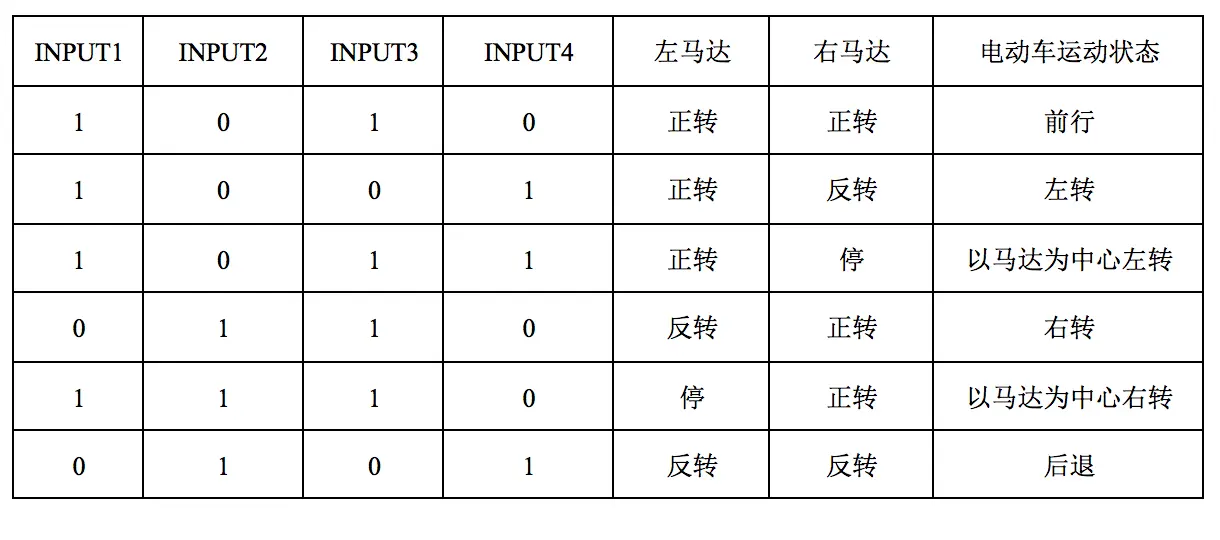 L293D是TI公司的产品,比较常见的是16脚PDIP封装。L293D通过TTL电平信号控制,由OUTPUT1,OUTPUT2和OUTPUT3,OUTPUT4驱动2个马达。INPUT1、INPUT2、INPUT3、INPUT4脚连接STC89C52RC的P0. 0、P0. 1、P0. 2、P0. 3口,控制马达的运动状态。ENABLE1,ENABLE2为控制使能端,对应与单片机的P0. 4、P0. 5口相连,控制马达的停转和PWM调速[8]。P0. 4、P0. 5口通过输出不同占空比的PWM波形来改变马达的快慢。占空比是指高电平持续时间在一个周期时间内的百分比。单片机输出PWM信号可采用软件延时或定时器两种方法,在此用的是软件延时的方法。当高电平延时时间到时,电平取反变成低电平,然后再延时;当低电平延时时间到时,电平取反变高电平,一直这样反复就能得到PWM波形[9]。VSS可接4.5~7V电压,给芯片的逻辑电路提供电压。VS电压范围为4.5~36 V,给输出端提供电压。L293D的真值逻辑和功能的对应如表4-1所示。 表L293D真值逻辑和功能对应表