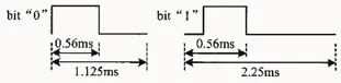 本次红外遥控采用的是NEC协议,调制方式为PPM脉冲位置调制,载波38kHz。位0和位1所不同之处就是在高电平脉冲后的低电平脉宽不一样,逻辑1为2.25ms,脉冲时间560us;逻辑0为1.125ms,脉冲时间560us。其波形如图所示。