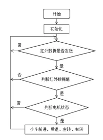 在本设计中,单片机主要是在主程序的控制下,定时对红外一体化接收头VS1838B接收的红外信号进行识别分析,读出的数据如果为0x12、0x18、0x14、0x16则分别对应控制小车的前进、后退、左转、右转。小车硬件系统软件设计的流程图如图4-7所示。