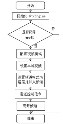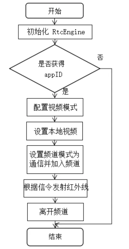 因为Android4.4及以上才有ConsumerIrManager类用来操控红外设备,所以本程序是基于Android 5.1系统的OPPO A51手机开发和测试的。用Android Studio开发,在此开发环境下完成Android手机终端的相关应用开发非常的方便[13]。 手机控制端实时视频功能的程序流程图如图所示。