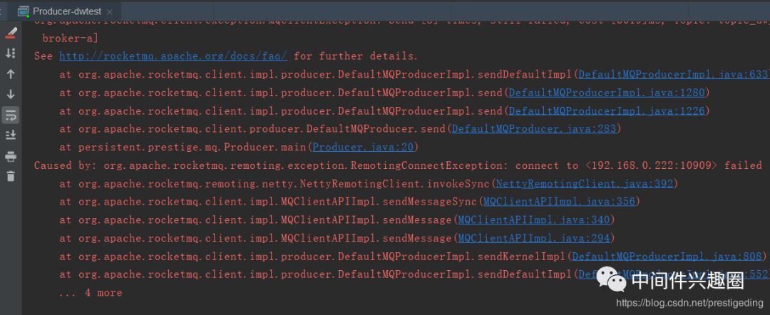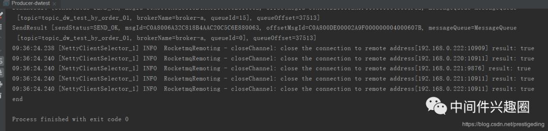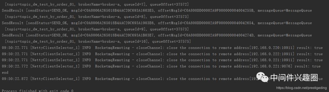 1public class Producer { 2 public static void main(String[] args) throws MQClientException, InterruptedException { 3 DefaultMQProducer producer = new DefaultMQProducer("producer_dw_test"); 4 producer.setNamesrvAddr("192.168.0.220:9876;192.168.0.221:9876"); 5 producer.start(); 6 for(int i =600200; i < 600300; i ++) { 7 try { 8 Message msg = new Message("topic_dw_test_by_order_01",null , "m" + i,("Hello RocketMQ" + i ).getBytes(RemotingHelper.DEFAULT_CHARSET)); 9 SendResult sendResult = producer.send(msg);10 System.out.printf("%s%n", sendResult);11 } catch (Exception e) {12 e.printStackTrace();13 Thread.sleep(1000);14 }15 }16 producer.shutdown();17 System.out.println("end");18 }19}