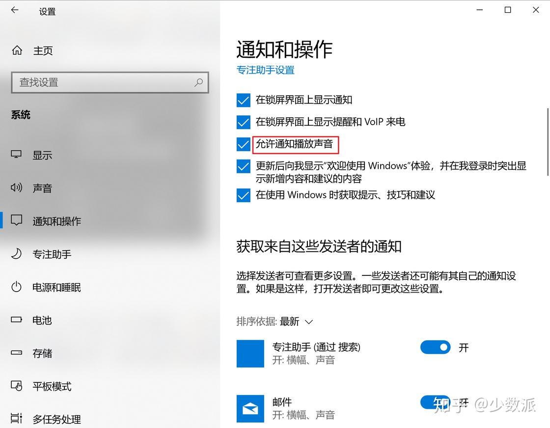 在新版系统中,Windows 加入了通知声音管理。进入「设置- 系统 - 通知与操作」,你可以选择是否允许所有通知播放声音,或者单独为某个应用设置是否打开通知声音。
