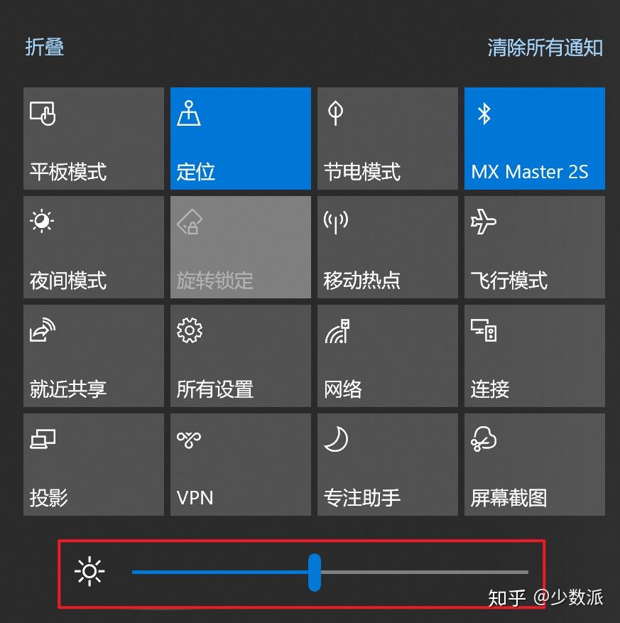 操作中心里的小开关可以方便地帮助用户快速打开和关闭一些常用的系统功能。在新版系统里,操作中心加入了调节屏幕亮度的功能,可以直接通过拖动的方式快速调节屏幕亮度。
