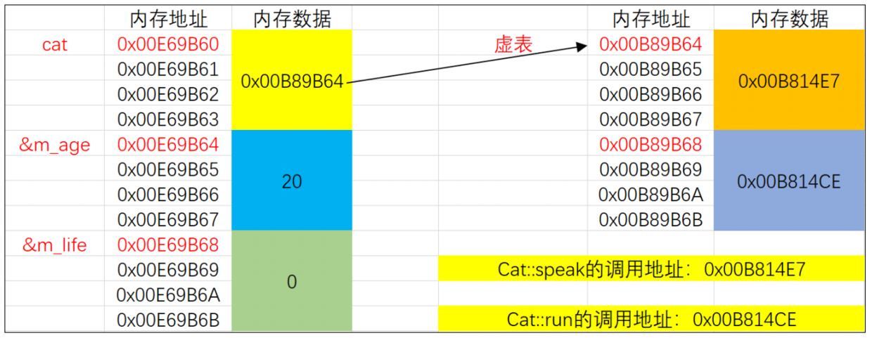 根据上图与代码,左边的内存地址就是一个cat对象占用的内存空间一共12个字节,其中8个字节用来存放成员变量m_age与m_life,最前面多出来的4个字节就是存放虚表的地址,该地址指向了一张虚表,虚表也叫做虚函数表,因为虚表里面存放的是函数地址。上图就是一个cat对象在内存中的情况。