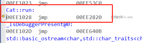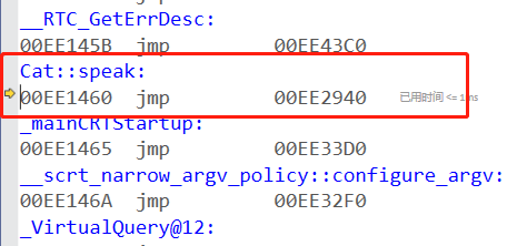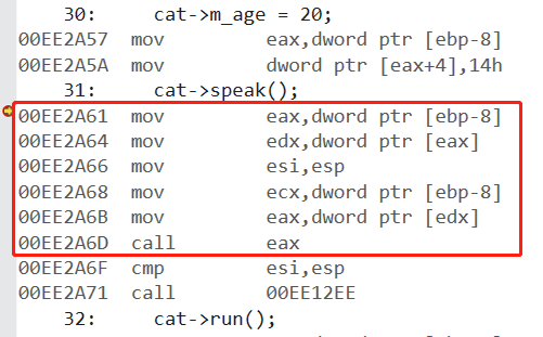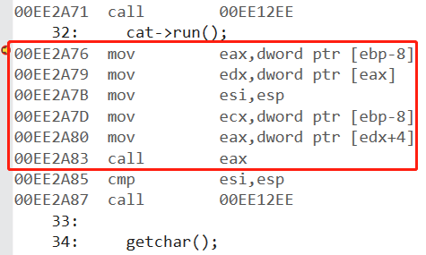 可以看到,现在汇编代码中的地址值为0x00ee1460与前面计算的地址值相等。所以虚表中前面的4个字节,是cat对象中speak函数的调用地址。现在将断点打在调用run函数的地方,再得到调用run函数的汇编指令。最终得到run函数的调用地址