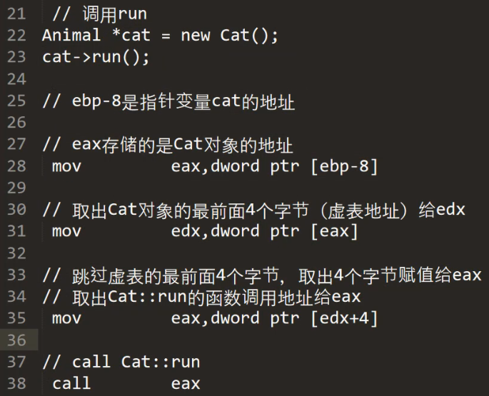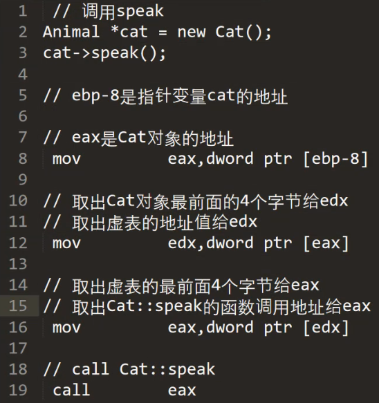 上图是在有虚函数时,调用speak函数的汇编指令。然后将指令进行剖析,得到下图