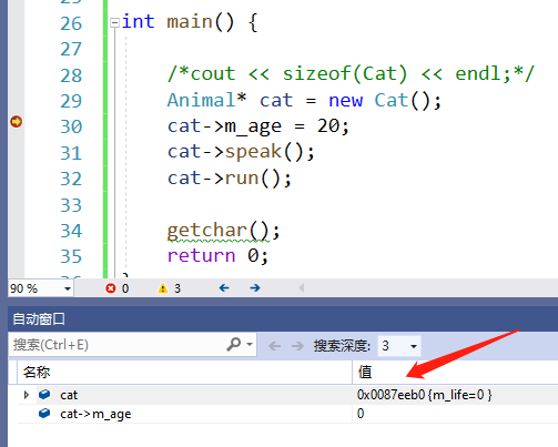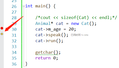 从该地址值开始的12个字节,就是cat对象的内存,为了证明该内存确实是为cat对象的内存,现在将代码跳过一行,执行cat->m_age,然后得到内存图