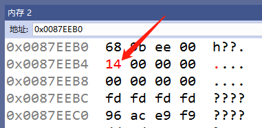 看到内存中的值发生了变化,并且16进制的14对应10进制的20,说明该块内存空间是m_age的地址。