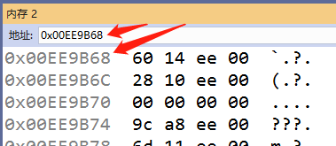 到这里已经得到了cat对象的地址,并且可以得到cat对象前4个字节中存储的内容,为68 9b ee 00,由于现在电脑是小端模式,最终的值为00ee9b68,则虚表的地址就位0x00ee9b68,然后再利用该地址,在内存中搜索,找到虚表的存储空间中存储的内容