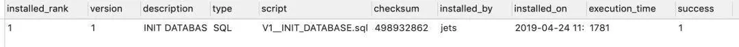 也就是说,实际上Flyway对数据库脚本版本的控制完全是依赖于维护了这样一张信息表。假设有个脚本已经被成功执行过,如果我们人为的删除这种表中的执行记录,会怎么样呢?答案是,Flyway会再次执行,并且因为执行过,如果脚本中有重建表的SQL,那么很可能会造成数据丢失的情况,所以使用Flyway对于这种表的维护是至关重要的,切记切记!