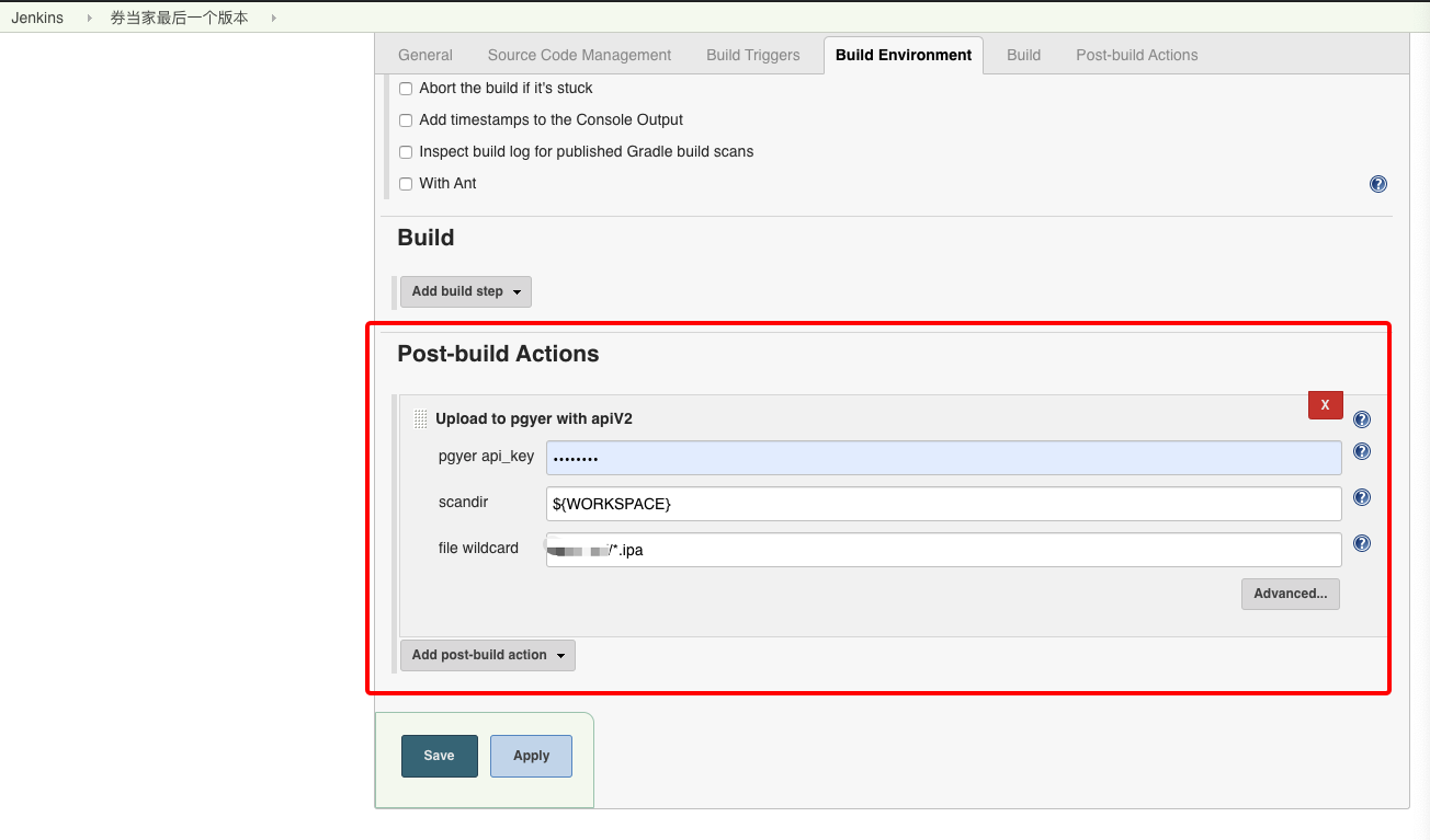 然后开始配置了,选择自己要配置的工程,在最底部添加Post事件即可,可以选择Upload to pgyer with apiV2,apiV1老是报错
