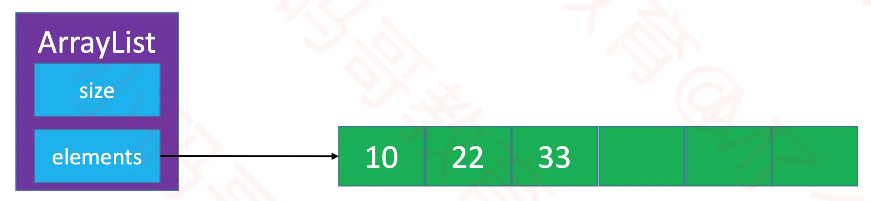 ArrayList如下图, 创建size属性来管理数组中元素的个数, 创建elements属性来管理存取的数据