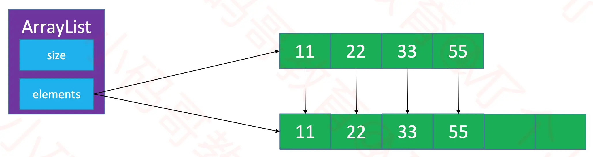 elements最大的容量只有10, 所以当数组存满元素时, 就需要对数组进行扩容 - 因为数组是无法动态扩容的, 所以需要创建一个新的数组,这个数组的容量要比之前数组的容量大