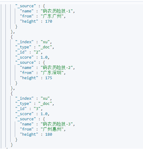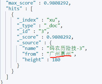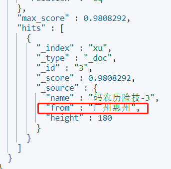 当然这种查询同时也是模糊匹配查询,我们查找"from"字段来自"惠州"的文档数据:
