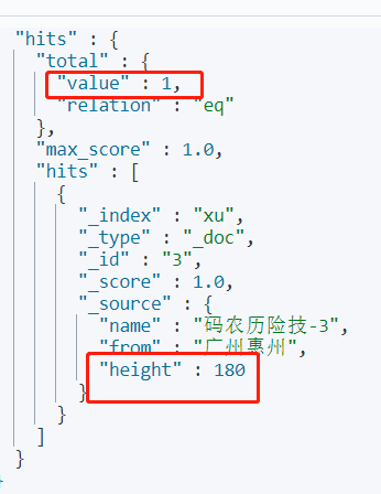 条件查询语法用"match"来匹配条件,比如要查找身高为180的文档数据:
