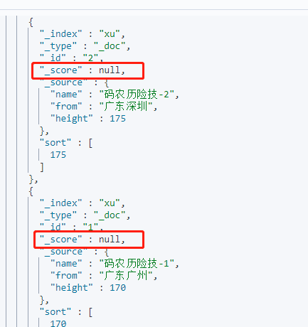 这里注意一下,我们加了排序条件之后,"_score"字段就是null值了,因为我们已经把ElasticSearch默认的打分规则(TF-IDF原理)给破坏掉了,这样就能够按照我们制定的排序规则来排序。