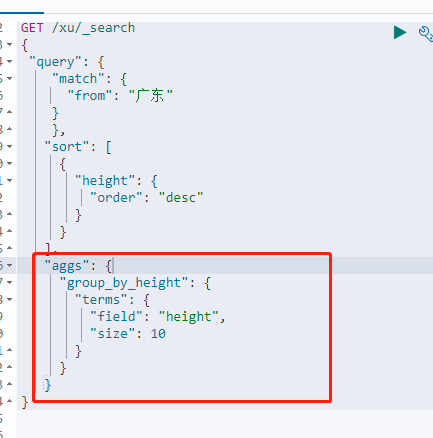 聚合查询一般用来统计数据的,以"aggs"字段实现聚合查询,比如说我要查询各个身高段的人有多少个: