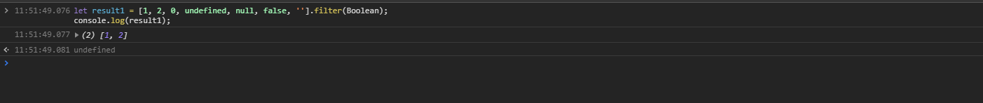 let result1 = [1, 2, 0, undefined, null, false, ''].filter(Boolean);