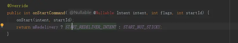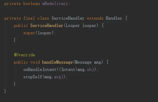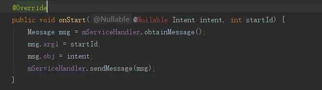 该方法中调用了onStart 方法,将传递Intent 对象封装成Message 数据,并主线程ServiceHandler 往子线程的MessageQueue中发送消息,因为发送消息的时候并没有给Message中的Callback赋值,所以消息最终会走到ServiceHandler 的handleMessage() 方法再调用 onHandleIntent()抽象方法,