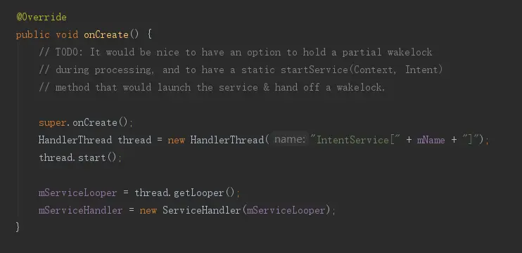 所以在开启IntentService 之后在onCreate 方法中 会初始化HandlerThread (集成自Thread 封装子线程),开启线程初始化子线程Looper