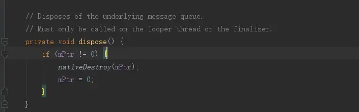 服务被销毁的时候OnDestory 方法中,我们找到子线程的Looper 退出的方法,这很符合当前这个服务用完就走的特点,当然当我们多次调用StartService 的时候,启动该服务的线程会往子线程的MessageQueue 中发送消息,即使我们服务突然挂了,消息队列中还有等待被处理的消息,也不会有事,因为onDestroy 方法中的子线程Looper 已经退出了最终调用了MessageQueue 中的dispose() 方法