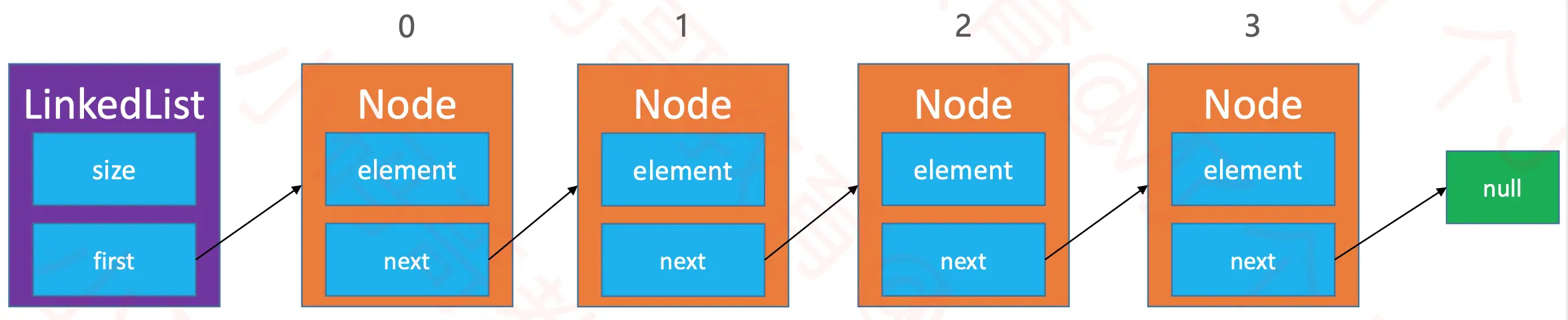 LinkedList, 用来管理链表数据, 其中的size属性记录存储数据的数量,first属性引用链表的第0个元素 - 创建私有类