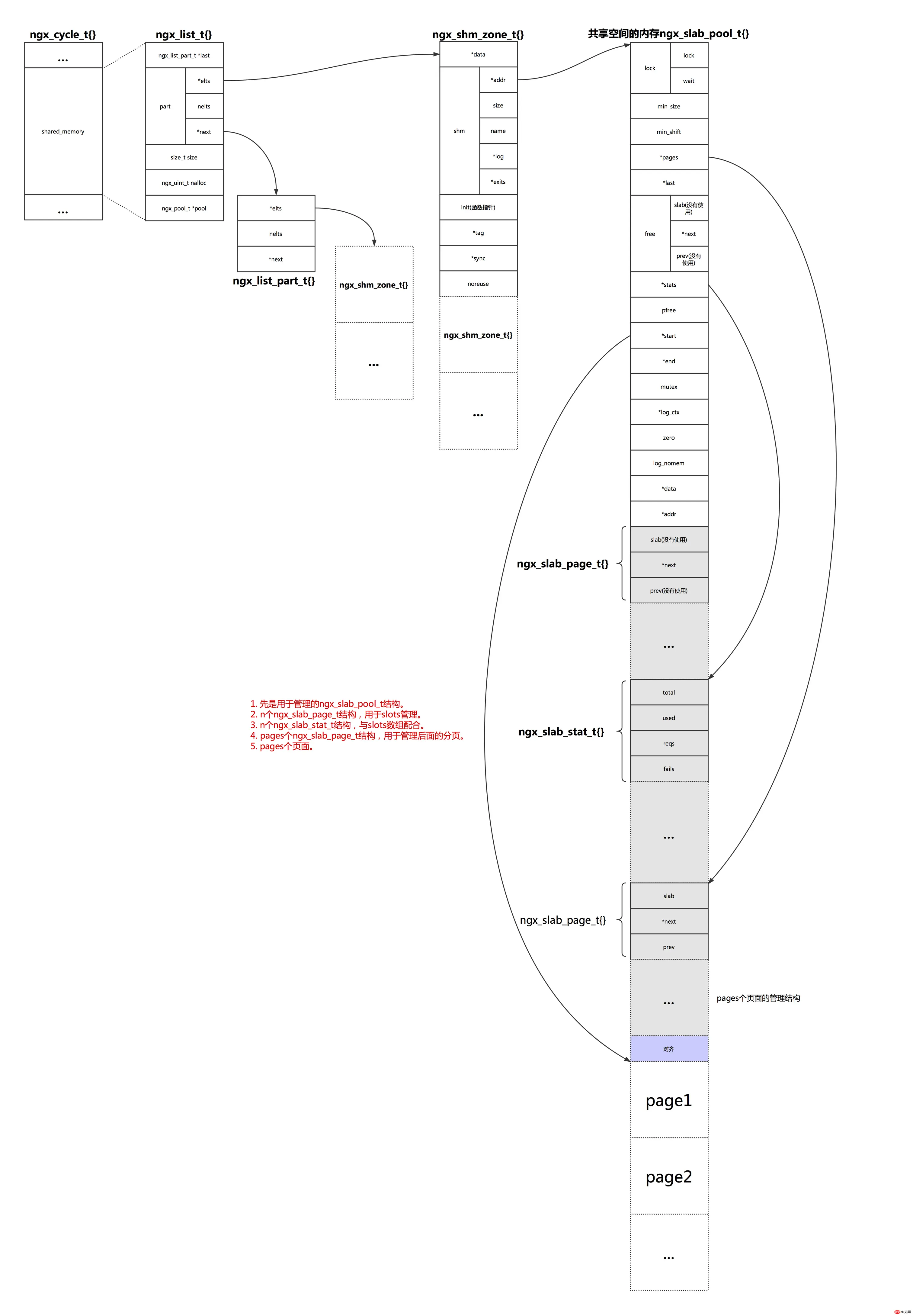 - 在上图中,除了最右侧的ngx_slab_pool_t接口开始的一段内存位于共享内存区外,其他内存都不是共享内存。