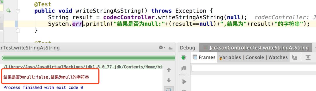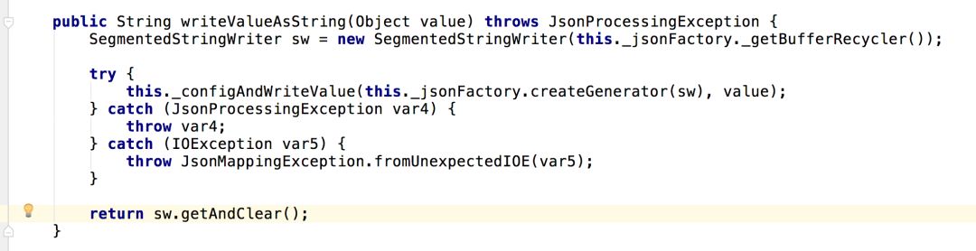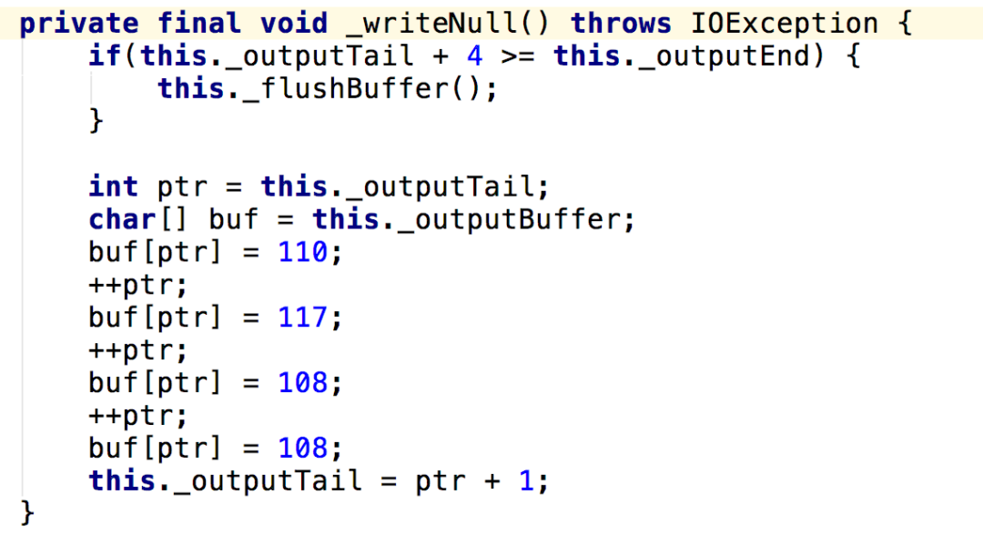 跟踪源码可看到真正产生这个结果的是WriterBasedJsonGenerator这个类。它就是打印了个null。